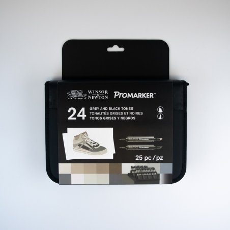 Promarker is the perfect introduction to sketching and colouring with alcohol based markers. Its broad and fine nibs make it easy to fill in large areas of colour before adding finer detail. The non-toxic, alcohol based inks provide smooth, flawless colour laydown every time. The colours in this set are great for creating tonal visuals and greyscale art, as well as adding shade and definition when working in colour. The wallet zips closed and opens to a stand to display and access your pens. There is a zipped compartment at the back of the wallet for extra ProMarker pens or accessories. Marker Case contains: 24 x Promarkers in colours Warm Grey 1, Warm Grey 2, Warm Grey 3, Warm Grey 4, Warm Grey 5, Ice Grey 1, Ice Grey 2, Ice Grey 3, Ice Grey 4, Ice Grey 5, Cool Grey 1 (x2), Cool Grey 2 (x2), Cool Grey 3 (x2), Cool Grey 4 (x2), Cool Grey 5 (x2), Black (x2) and the Blender pen (x2).